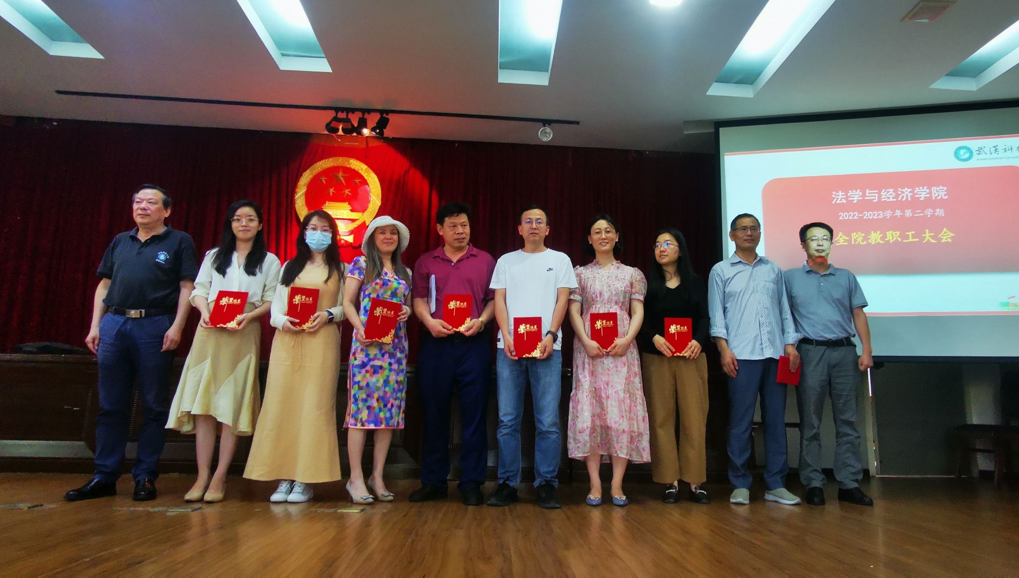 2022-2023学年第二学期全院大会暨2022年度表彰大会在教四楼41302模拟法庭召开。会议由学院党委副书记刘英主持,学院领导班子成员以及全体教职工参与会议。