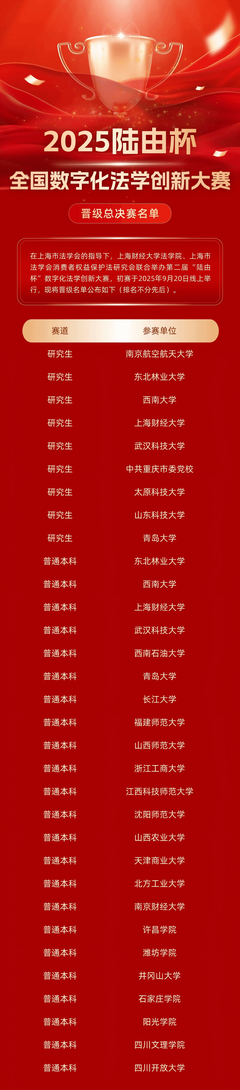 2025年9月20日,由上海市法学会指导,上海财经大学法学院、上海市法学会消费者权益保护法研究会联合举办的第二届“陆由杯”全国数字化法学创新大赛初赛在线上成功举行。