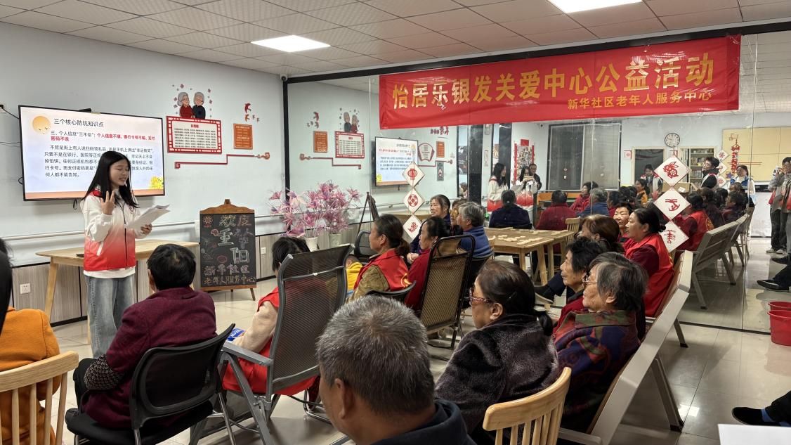 活动在怀旧老歌的“击鼓传花”破冰游戏中拉开帷幕,老人们在轻松愉快的氛围中积极参与、相互认识,迅速拉近了与志愿者的距离。在核心的普法宣讲环节,志愿者化身“防骗小讲师”,围绕“个人信息三不给”、“诈骗电话三步骤”、“保健品两不信”三大核心知识点,结合社区发生的真实案例进行生动讲解。通过播放改编自老人真实经历的反诈短视频,瞬间引发了老人们的共鸣。随后的互动判断环节,“有人让你扫二维码领鸡蛋,给不给?”志愿者们提问的话音未落,老人们便齐声摆手高呼“不给!”,在欢声笑语中将防骗口诀牢记于心。