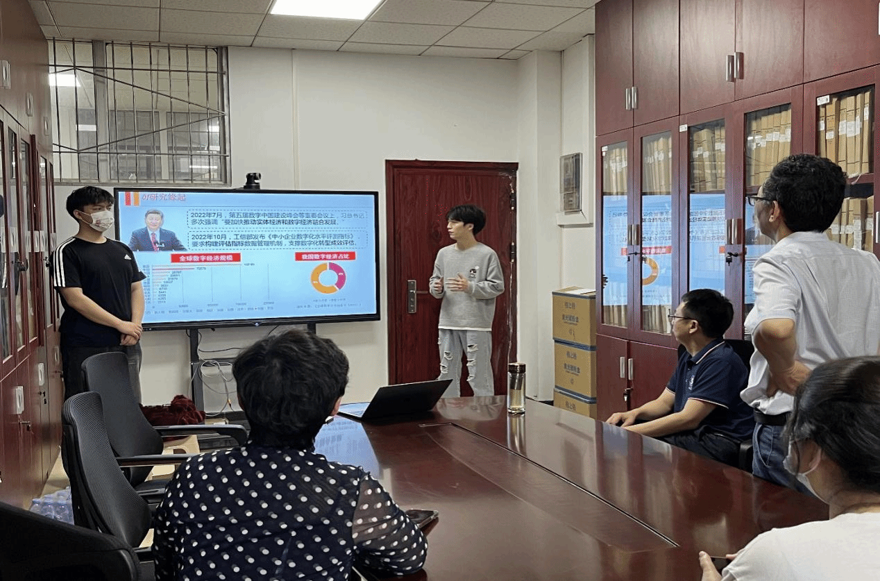 “数字红”团队队长柯松和成员冯勇进行了计时5分钟的模拟现场展示,该答辩流程和规范严格按照决赛要求,展示完毕后接受专家提问。“民营企业的数字化转型是关乎数字经济高质量发展的关键因素,我们团队历时近三个月的调研,收集了湖北省内7个市州共160家企业的实地调研数据,构建了4个一级指标与13个二级指标组成的评价企业数字化转型指标体系……”冯勇从研究缘起、研究思路、研究发现、评估成果、创新之处、作品影响力等方面对作品进行了现场展示,整个过程一气呵成,表述流畅,体现了“数字红”队对于省级决赛前的充分准备。