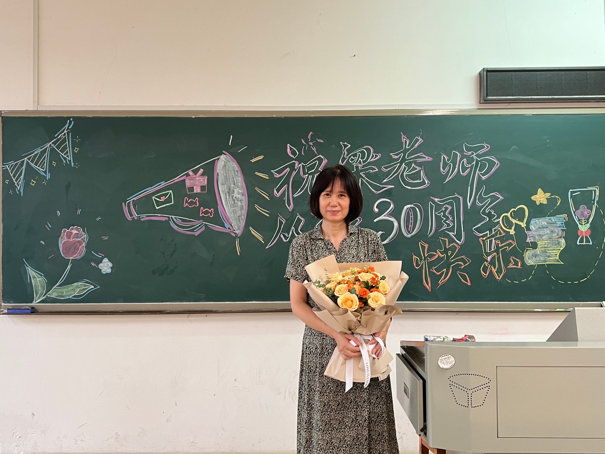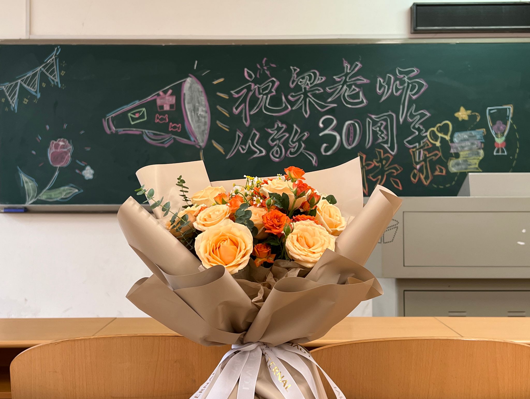 民法学老师梁东新准备了黑板报惊喜,并在梁东新上课时送上鲜花和祝福。