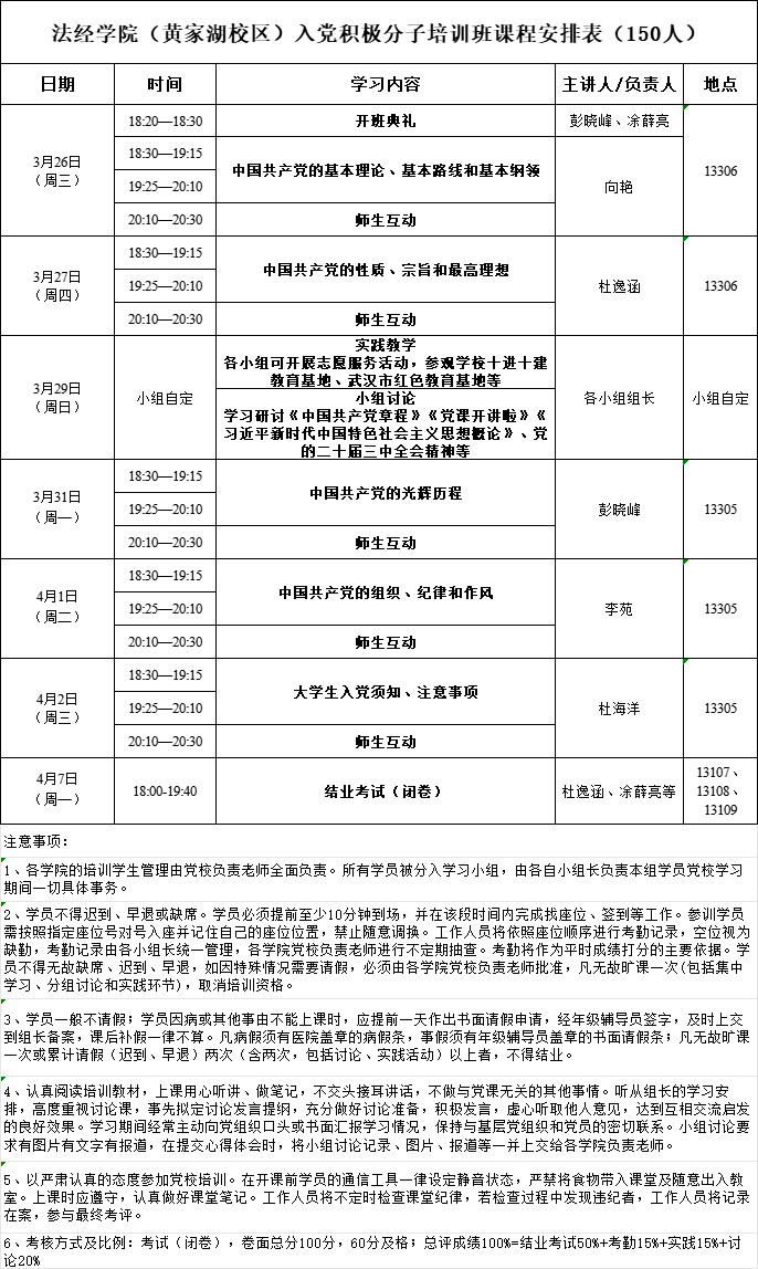 其中考勤统一签到;研讨、实践活动需8-10人自行组成小组于3月29日自行开展,并提交相关记录,相关记录请从学院网站党建工作-党校工作-“党课培训小组讨论、实践活动”中下载。