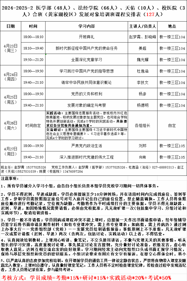 其中考勤统一签到;研讨、实践活动需8-10人自行组成小组于4月26日自行开展,并提交相关记录,相关记录请从学院网站党建工作-党校工作-“党课培训小组讨论、实践活动”中下载,并于4月28日前发送至邮箱[email protected],逾期未提交均按未完成处理。